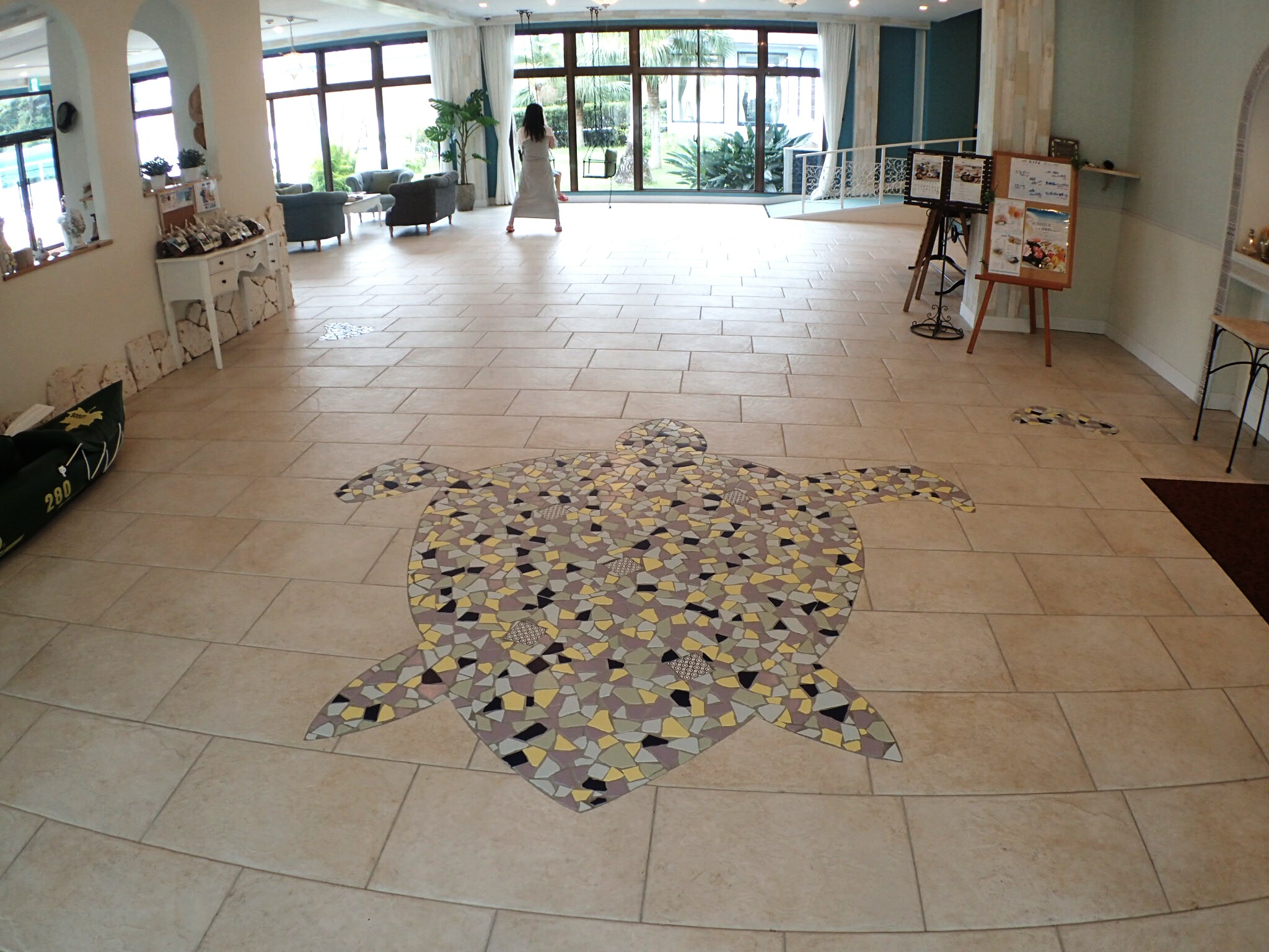ホテルのフロントや至るところにカメのマークがあるんです。