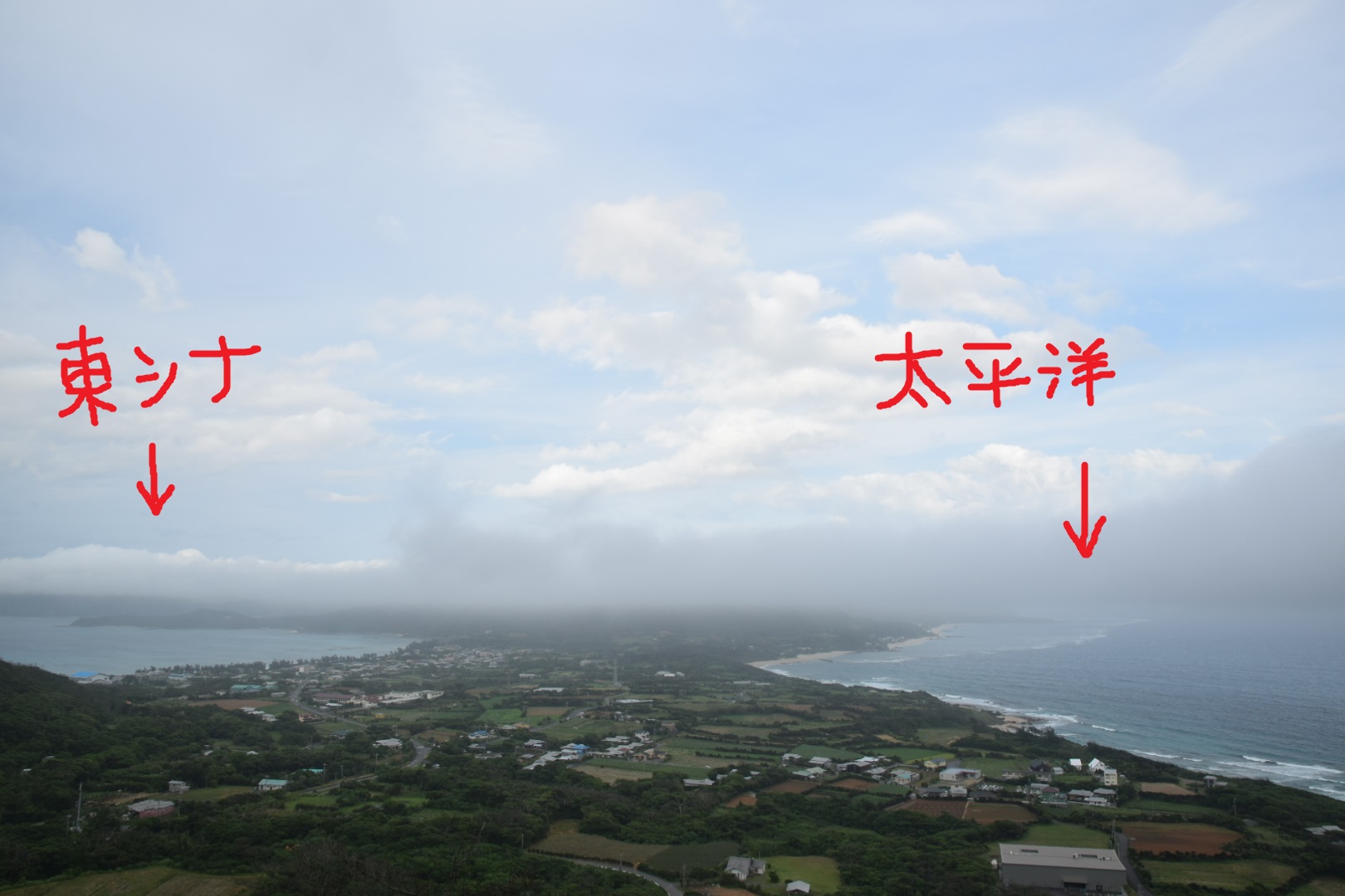 逆に、上空からは大きく広がったサンゴ礁や県道を走る車はもちろん、